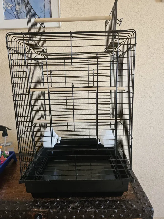 Detalles del productoJaula metálica negra para pájaros con accesorios.