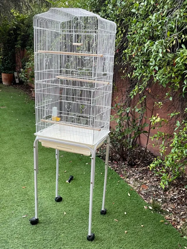 Detalles del productoJaula blanca para pájaros, ideal para mantener a tus mascotas seguras y cómodas. Incluye un soporte con ruedas para facilitar su movilidad.