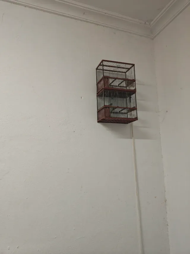 Jaula para pájaros de madera con tres niveles. - Estructura de madera oscura. - Rejas metálicas. - Ideal para pájaros pequeños.