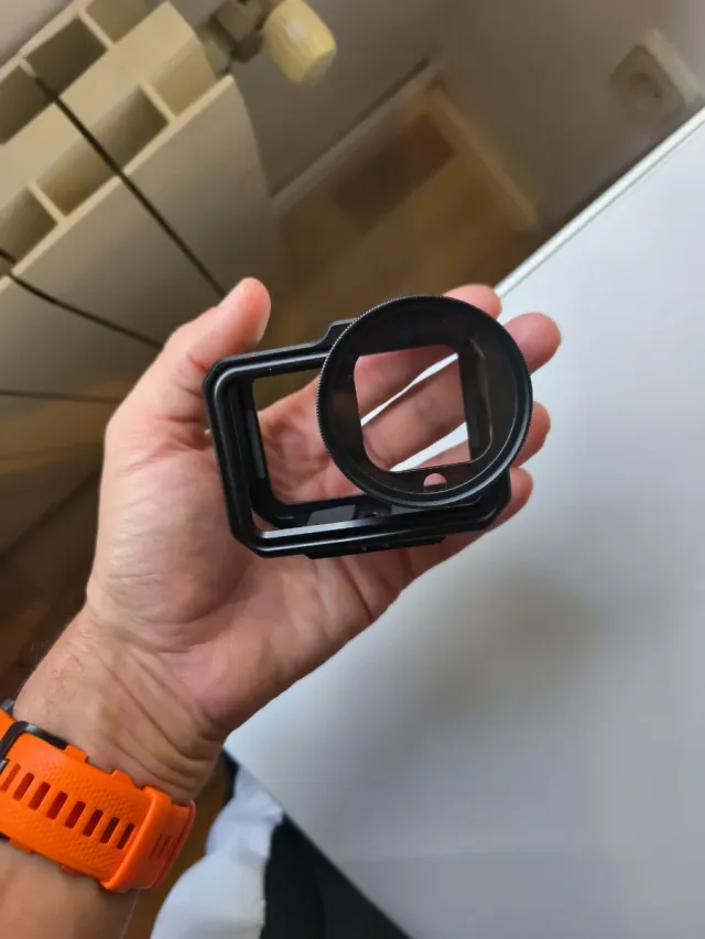 Jaula protectora negra para cámara GoPro. - Diseño robusto y ligero. - Permite acceso a puertos y botones. - Ideal para montaje en accesorios.