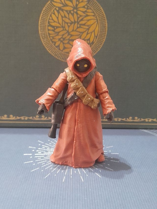 3,75 pulgadas 9,5cm Figura de acción del personaje Jawa de Star Wars. - Atuendo de color naranja. - Incluye accesorios. - Detalle de bolsa de munición cruzada.
