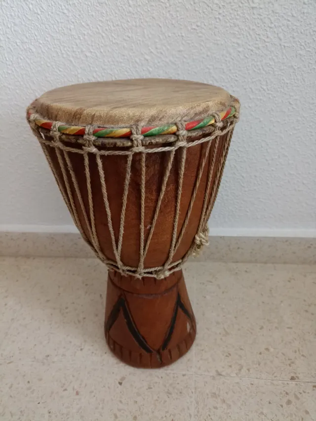 Instrumento musical de percusión africano. - Fabricado en madera. - Diseño artesanal. - Cuerdas para tensar la piel. - Medidas: altura 40cm y 22cm de circunferencia