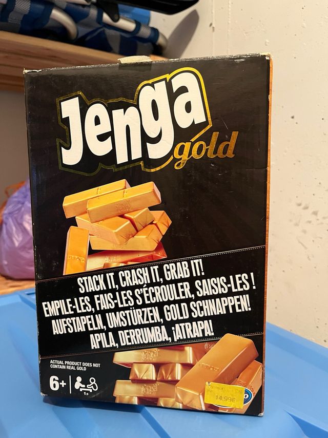 Juego de mesa Jenga Gold. ¡Apila, derrumba y atrapa! - Incluye bloques dorados. - Apto para mayores de 6 años. - Advertencia: El producto no contiene oro real.