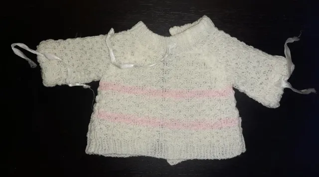 Detalles del productoJersey antiguo de punto en blanco y rayas rosa para blanco, Lazo en cuello y puños.