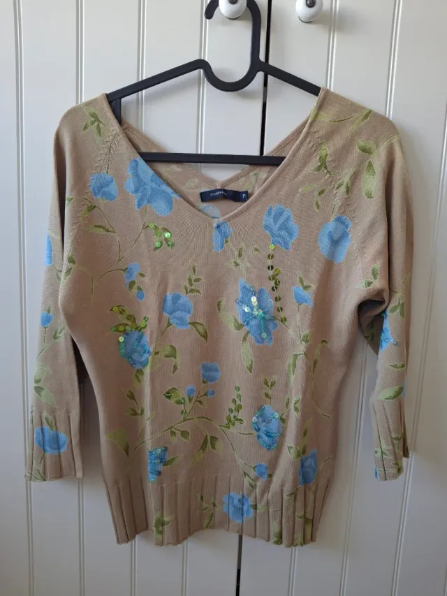 Jersey beige de punto fino con flores turquesas y detalles de lentejuelas