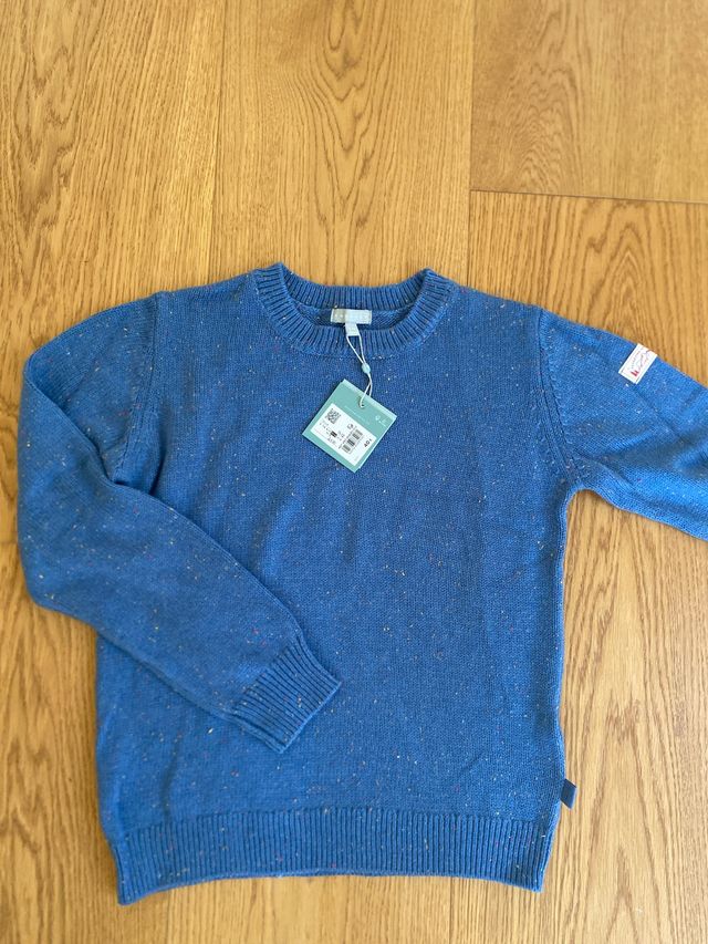Jersey de punto con cuello redondo y detalle jaspeado. - Talla 11-12 años. - Color azul. -60% algodón, 30% poliamida y 10% lana - Sin estrenar. la