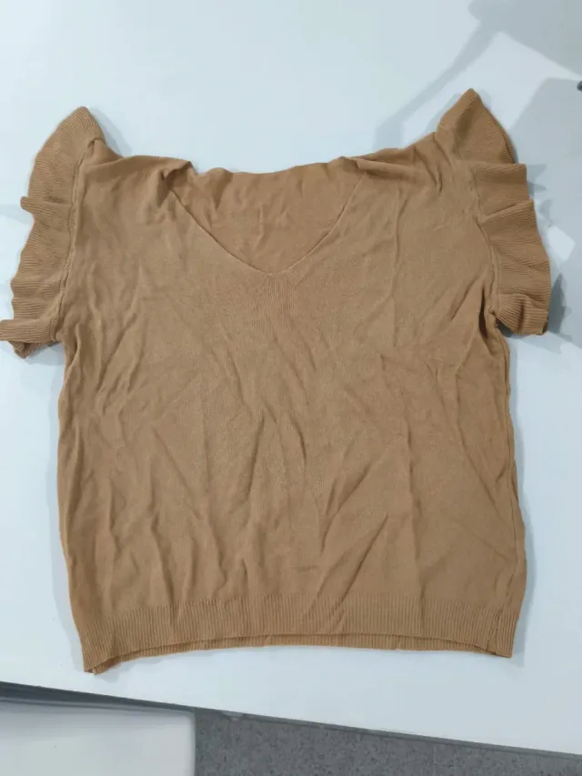 Jersey corto de punto en color marrón. Presenta un diseño con cuello en pico y mangas cortas con volantes. - Manga corta con detalle de volantes. - Cuello pico.