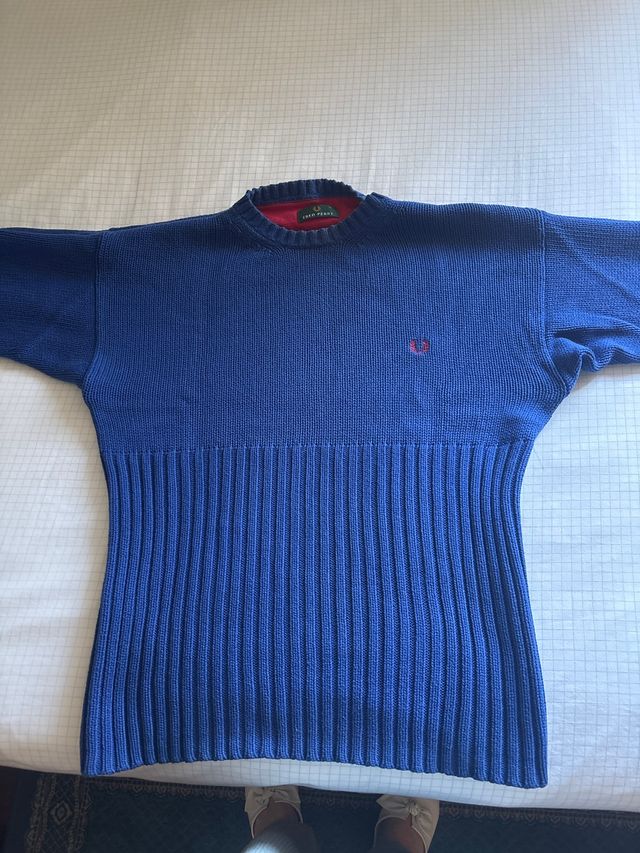 Jersey de lana de color azulón con cuello redondo y manga larga. Presenta un diseño de punto acanalado en la parte inferior y un pequeño logo bordado en el pecho.