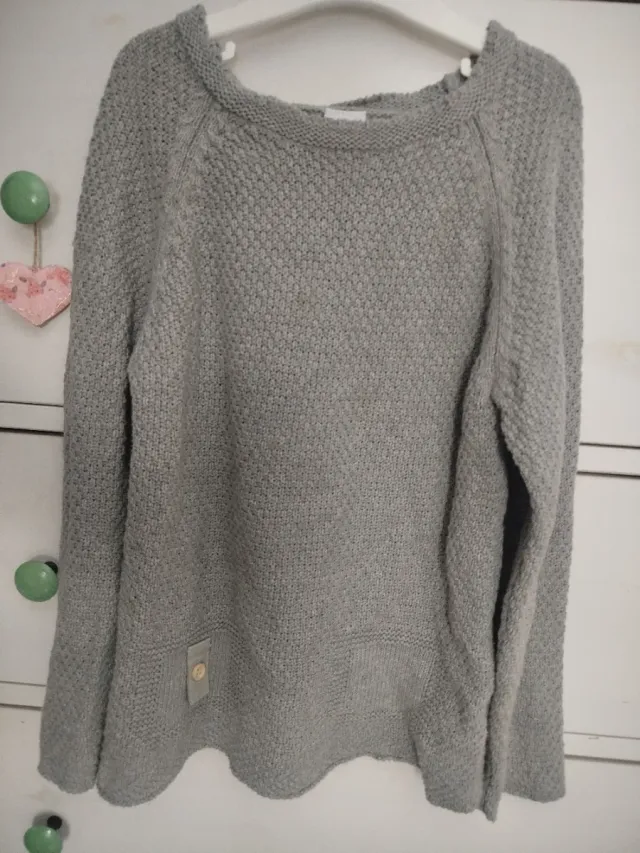 Detalles del productoJersey de punto en color gris, confeccionado en algodón. Presenta un diseño con textura y un detalle de botón en la parte inferior.