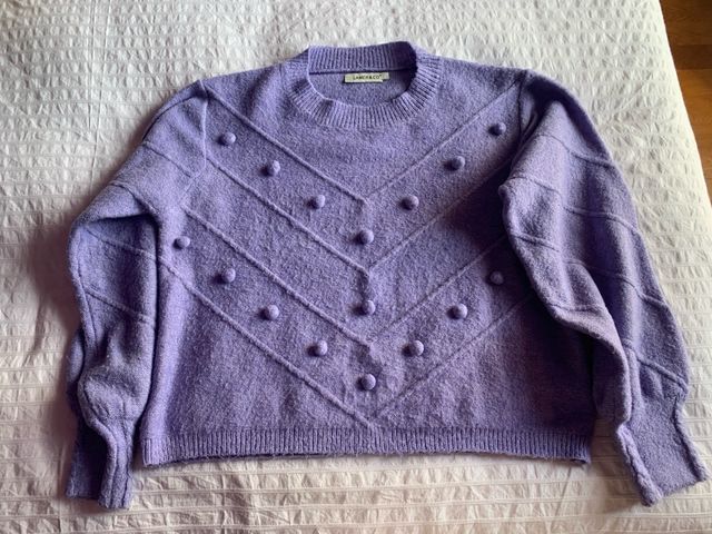 Jersey oversize de punto fino en color lila. Presenta un diseño de espigas con pompones.