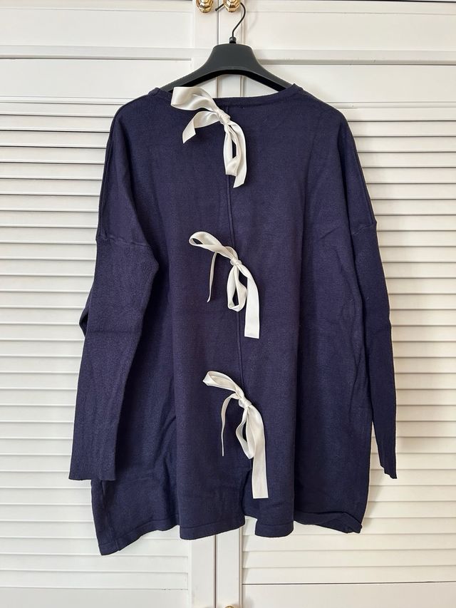 Jersey ancho overside azul marino con lazos en la espalda. Talla única (como talla L o más). Suéter mujer