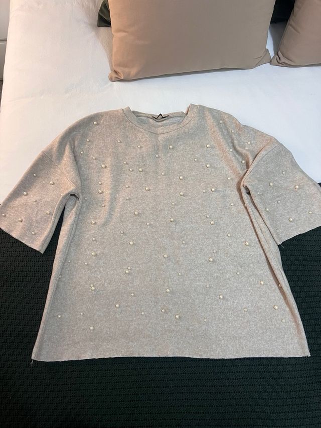 Jersey de manga corta con un bonito detalle de perlas repartidas por toda la prenda. Es una pieza elegante y versátil.