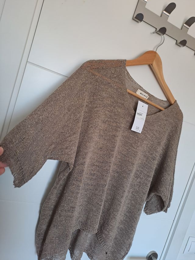 Precioso jersey ligero de punto y manga corta en color topo de Mulaya, perfecto para las temporadas de primavera y verano. Su diseño versátil lo hace ideal para cualquier estilo y ocasión. Hecho en Italia. Composición: 78% acrílico y 22% poliamida. Dimensiones: 44cms de cuello a final de manga, 50cms entre hombros, 60cms de hombro a abajo y 60cms de axila a axila. Un básico para el armario. Talla única. Sin estrenar: con etiquetas.