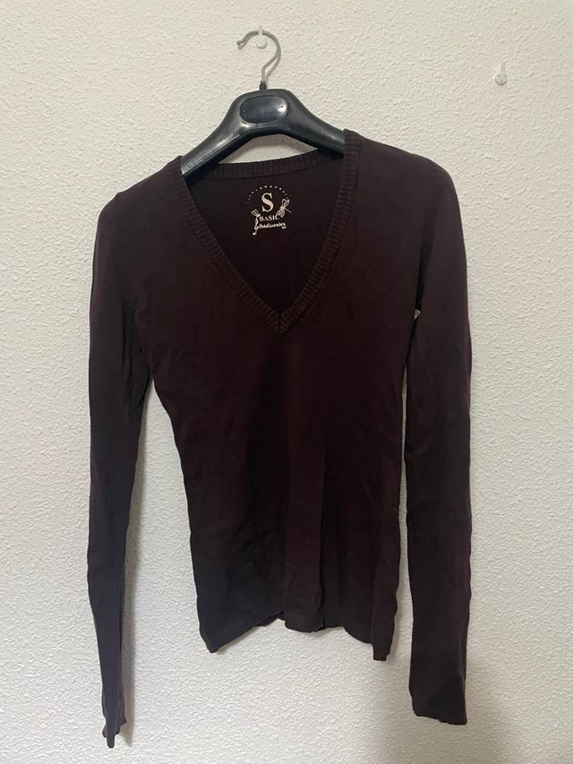 Jersey básico de manga larga con cuello en pico. - Color marrón chocolate - Talla S.