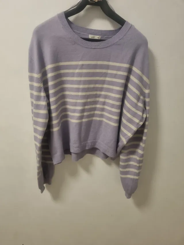 Jersey morado a rayas verticales en blanco.
