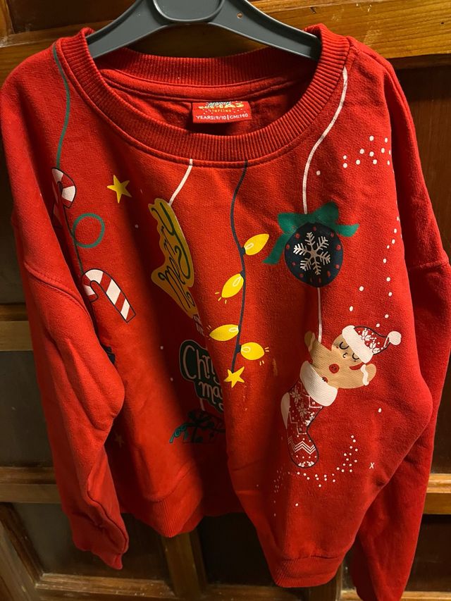 Jersey de manga larga con estampado navideño. - Color rojo. - Estampado con motivos navideños como luces, bastones de caramelo y un reno. - Talla 9-10 años (140 cm).