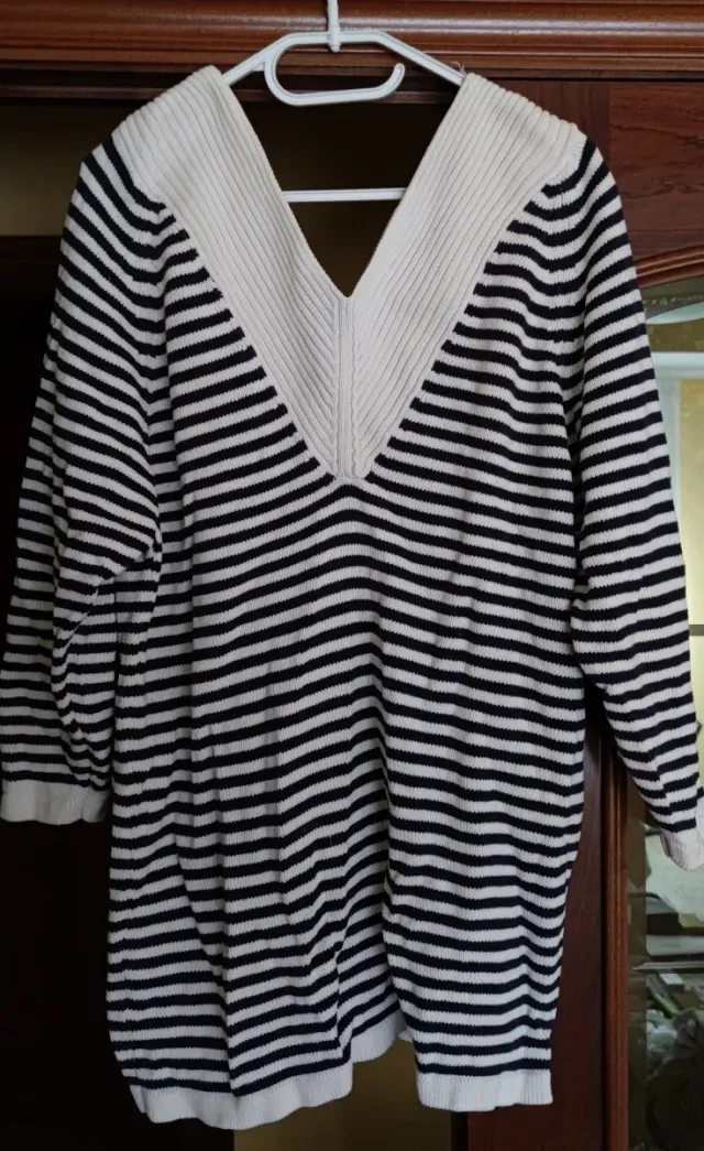 Jersey de punto con diseño de rayas horizontales en azul marino y blanco. Cuello en V con detalle de canalé.