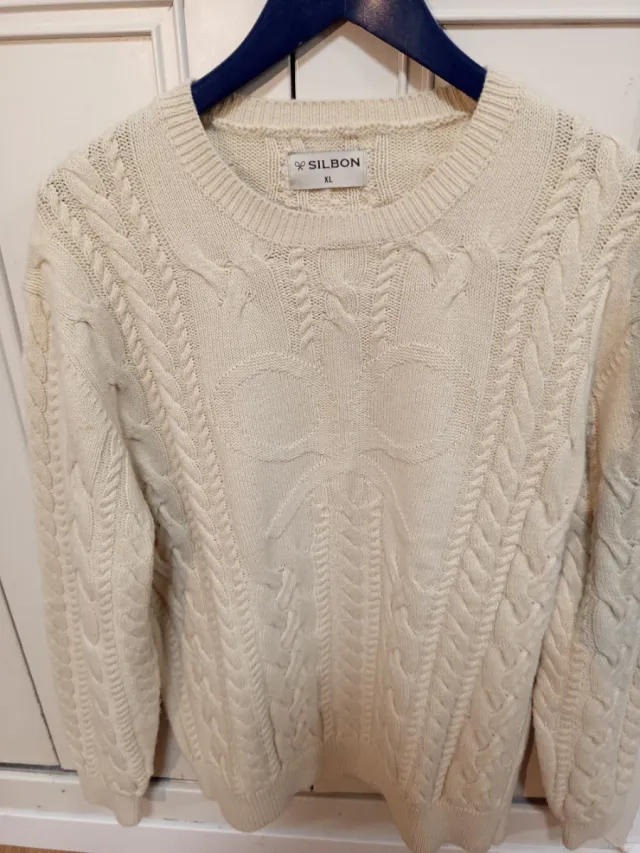 Jersey de punto grueso con diseño trenzado en color beige. Un básico con un toque especial.
