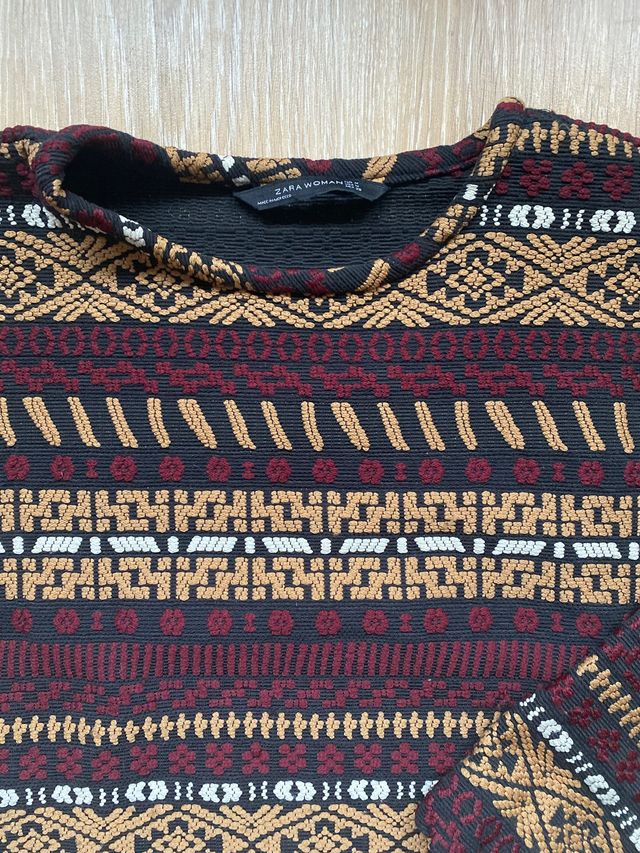 Detalles del productoJersey jacquard con cenefas en mostaza, granate y blanco. Corte oversize anchito. En perfecto estado. Más de 200 prendas a la venta en mi perfil. #zara #zarawoman #jacquard #jerseymujer