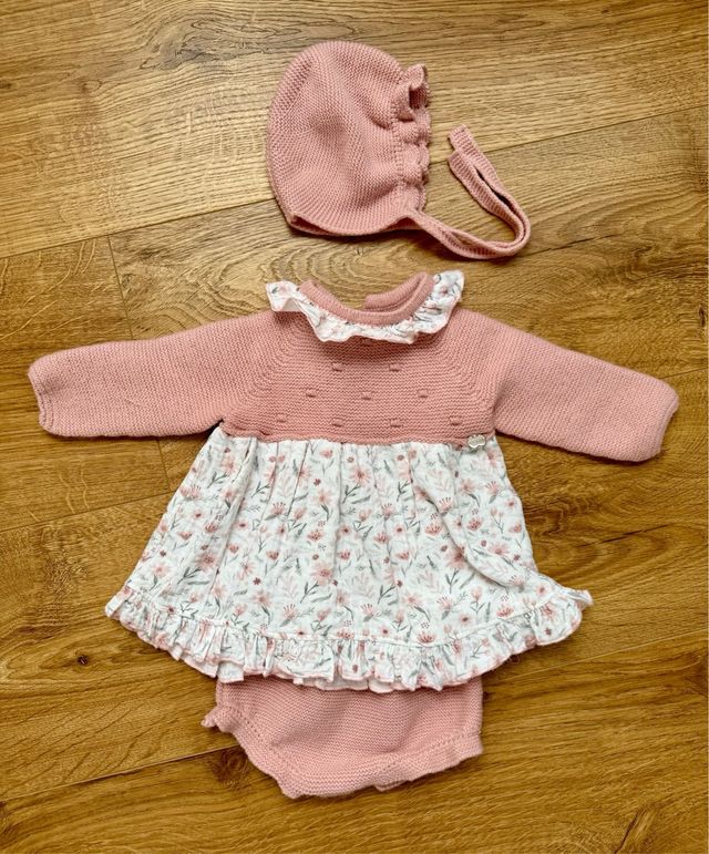 Conjunto de jesusito y capota para bebé en color rosa. Talla 3 meses. - Jesusito con estampado floral. - Capota a juego. - Tejido de punto.