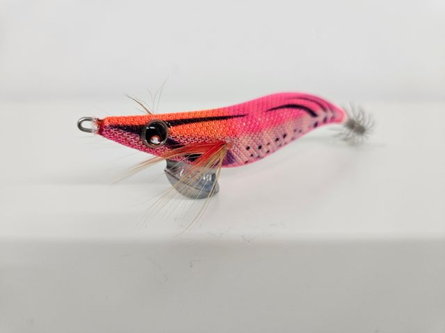 Detalles del productoPreciosa jibionera Yo-Zuri para la pesca de calamares. Es de color rosa y naranja, con detalles en negro. Tiene un diseño atractivo y llamativo.