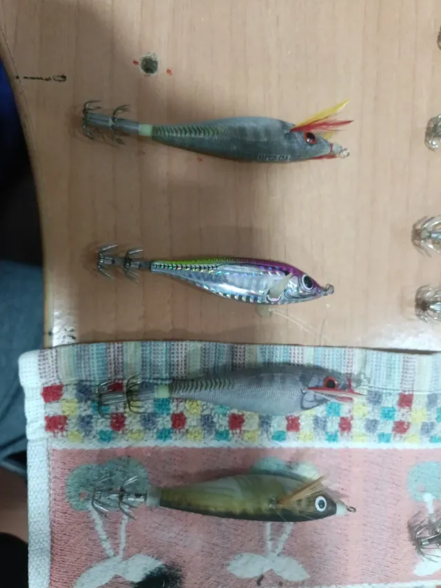 Lote de jibioneras para pesca. - Variedad de señuelos para pesca. - Diseños realistas para atraer a las presas. - Anzuelos triples incorporados.