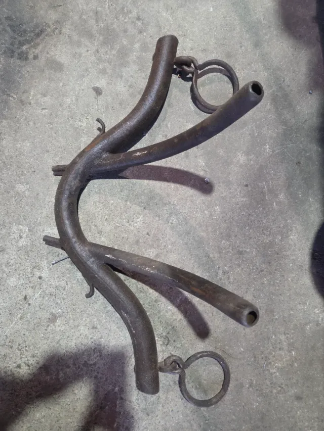Detalles del productoPieza de hierro forjado con un diseño curvo y dos extremos tubulares. Presenta anillas metálicas en ambos extremos.