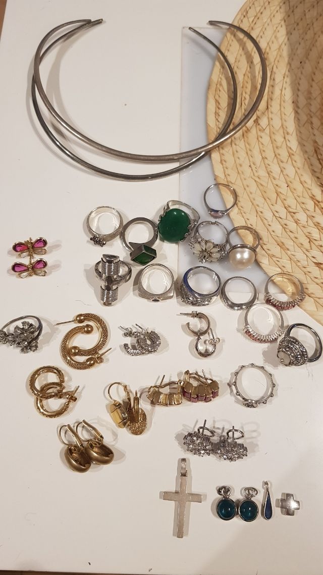 Detalles del productoconjunto de pendientes, anillos y collares. Son de plata y acero. El precio de cada pareja de pendientes es de 4 eur cada uno, cada anillo 5 eur y los collares a 10.Se vende todo el conjunto no por separado.