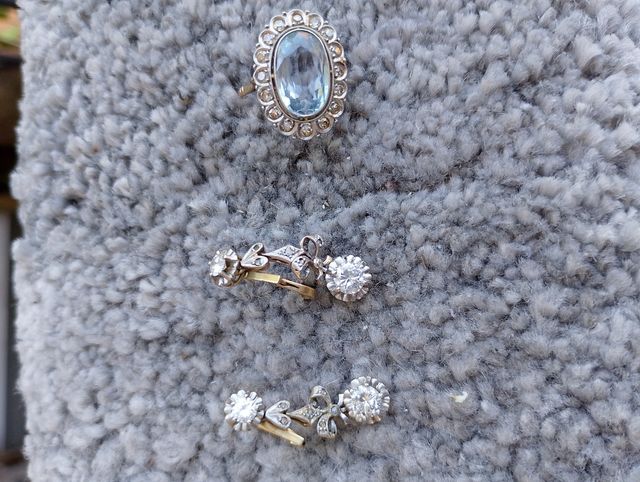 Exquisitos pendientes de oro y brillantes y anillo de oro y aguamarina antiquísimos