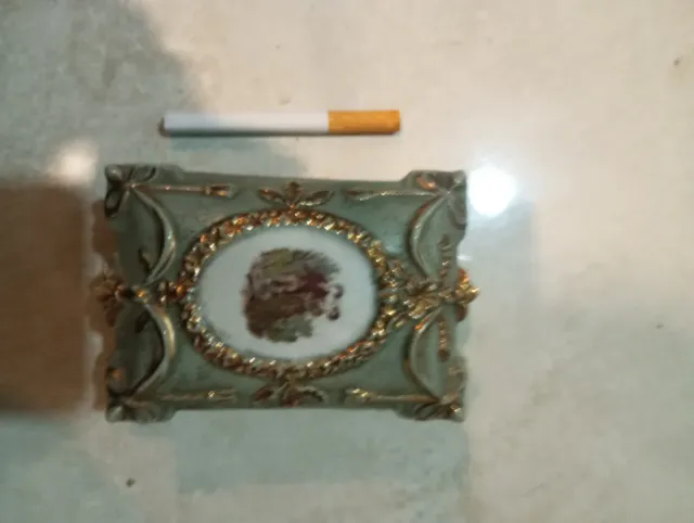 Pequeño joyero antiguo con un diseño muy detallado y un acabado elegante. - Marco con detalles dorados. - Diseño ovalado en el centro. - Tonos verdes y dorados.