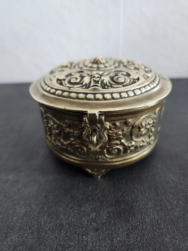 caja, joyero, antigüedad, coleccionismo,redondo,siglo XX bronce,plateado,vintage,dorado
