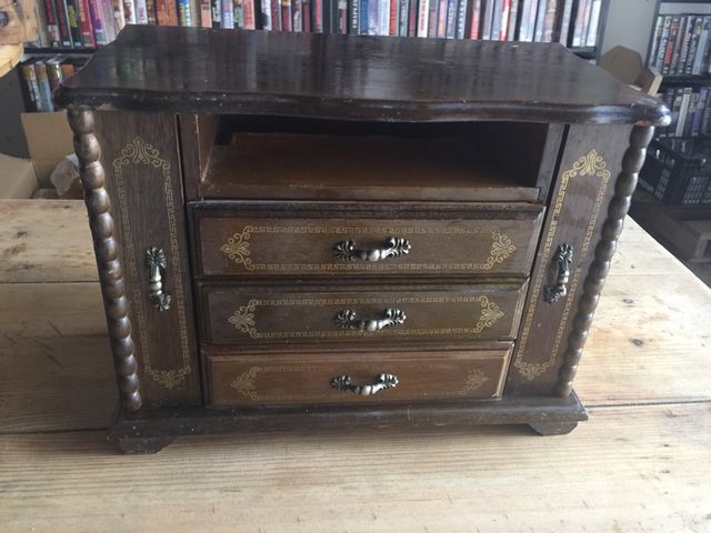 Joyero llavero antiguo de madera con cuatro cajones y dos laterales que se abren para guardar cosas. Falta un cajón que un manitas lo puede tapar y queda genial.