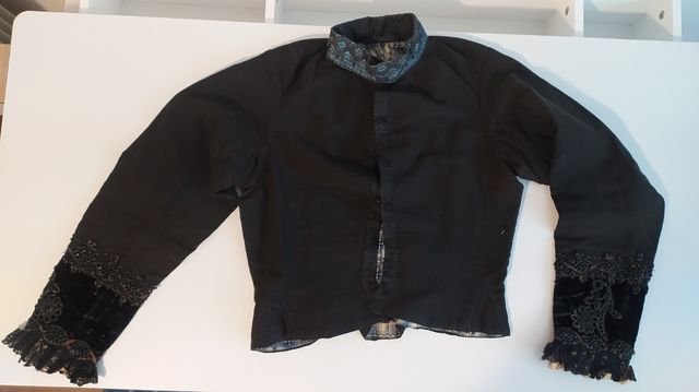Detalles del productoJubón o chambra de principios del siglo XIX en color negro con mangas con terciopelo y abalorios de azabache. En buen estado de conservación. Con un par de zurcidos antiguos, ver fotos. Encaje en las mangas en color negro y crema en buen estado de conservación. Forro de cuadros. Medidas: