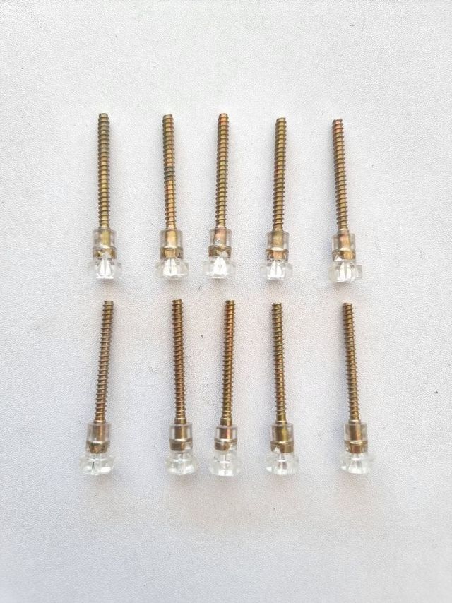Detalles del productoVendo juego de 10 tornillos de cabeza de plastico transparentes (longitud 51 mm aprox.) nuevos para las tulipas pilotos de SEAT,dispongo de varios juegos.(C1)