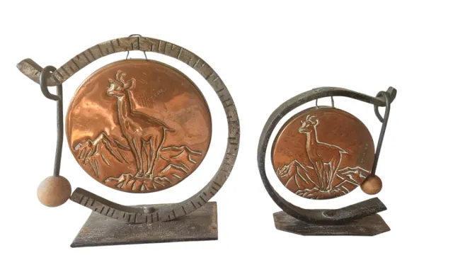 Conjunto de dos gongs antiguos con un diseño único con soporte de hierro. Medidas 14×14, 10×10cm.