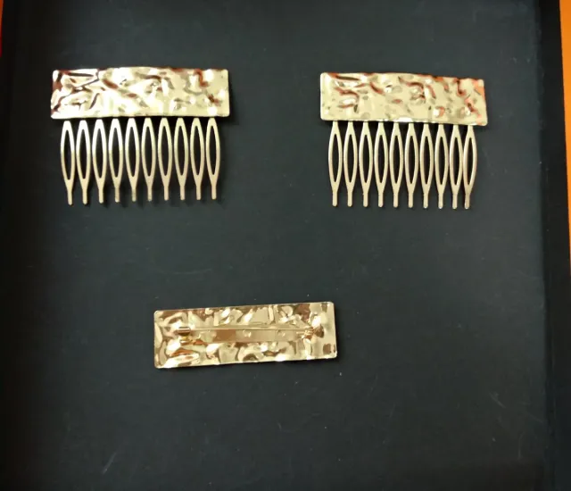Incluye dos peinetas y un broche con diseño en estilo vintage y acabado dorado con textura martillada.
