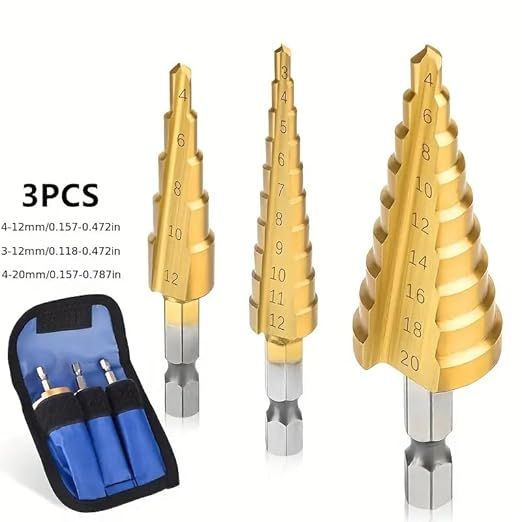 Detalles del productoSet de 3 brocas escalonadas con revestimiento de titanio. Incluye una práctica bolsa para guardarlas.