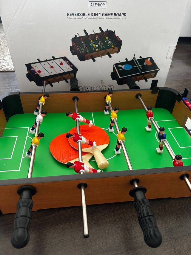 Divertido juego 3 en 1 para horas de entretenimiento. Incluye futbolín, ping-pong y mesa de hockey. - Tablero reversible. - Diseño compacto.