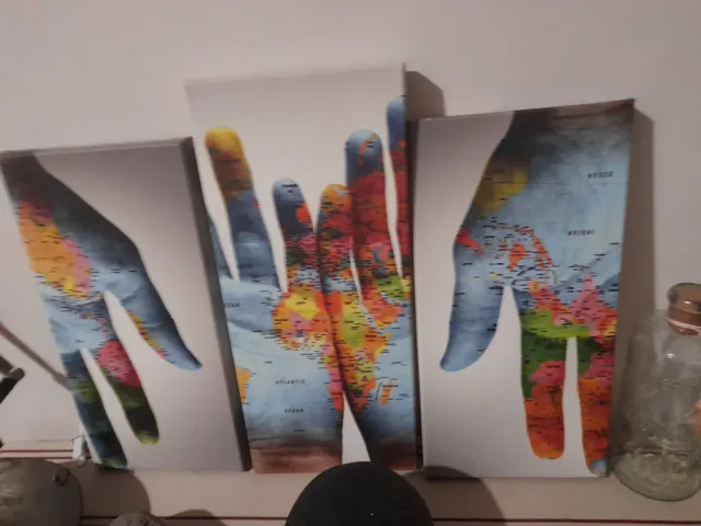 Detalles del productoConjunto de tres lienzos decorativos con un diseño original de manos que forman un mapa del mundo.
