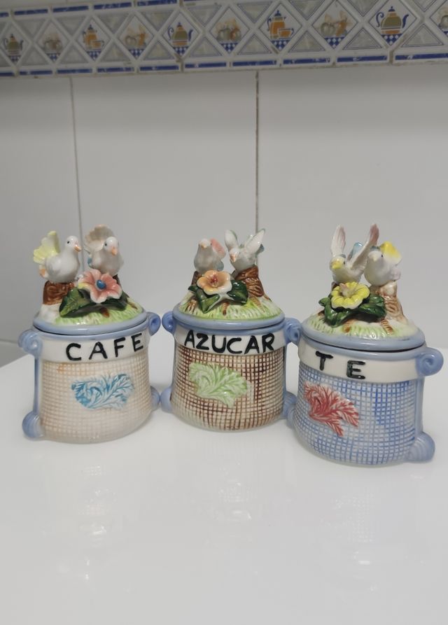 Detalles del productoPrecioso juego de tres tarros de cerámica para café, azúcar y té. Ideales para darle un toque vintage a tu cocina.