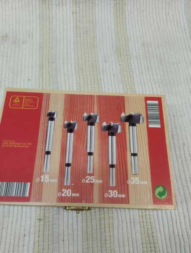Set de 5 fresas para madera de diferentes tamaños. Fabricadas en metal. - Diámetros: 15 mm, 20 mm, 25 mm, 30 mm y 35 mm. - Incluye caja de madera para almacenamiento.