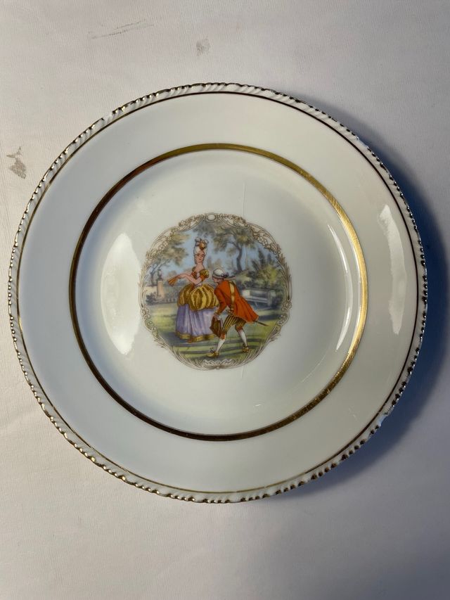Detalles del productoPrecioso conjunto de 5 platos antiguos de postre con escena galante de inspiración francesa (estilo siglo XVIII). Decoración central romántica con marco ornamental, fileteado dorado y borde perlado en relieve.