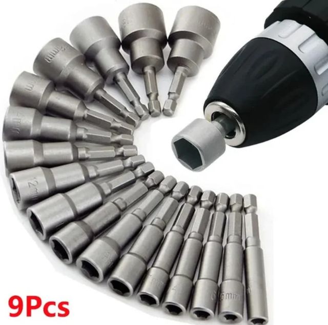 Set de 9 llaves de vaso hexagonales para taladro eléctrico.Juego de llaves de vaso 9 hexágonales, 5 a 13 mm, con adaptador hexagonal para taladro eléctrico o portapuntas.