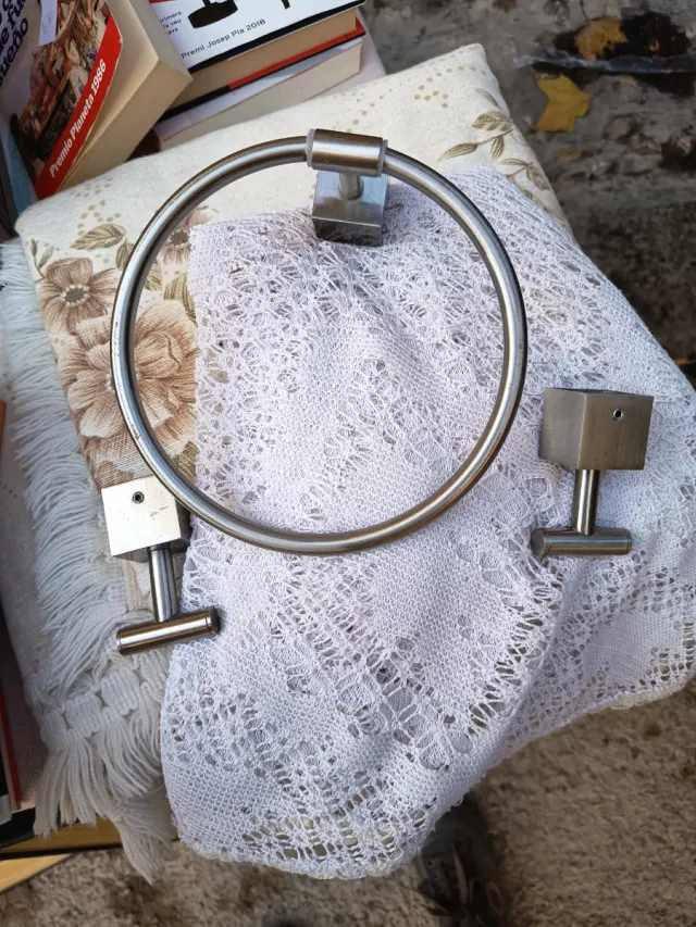 Conjunto de accesorios para el baño en acabado metálico. - Aro toallero. - Dos soportes. - Diseño moderno y funcional.