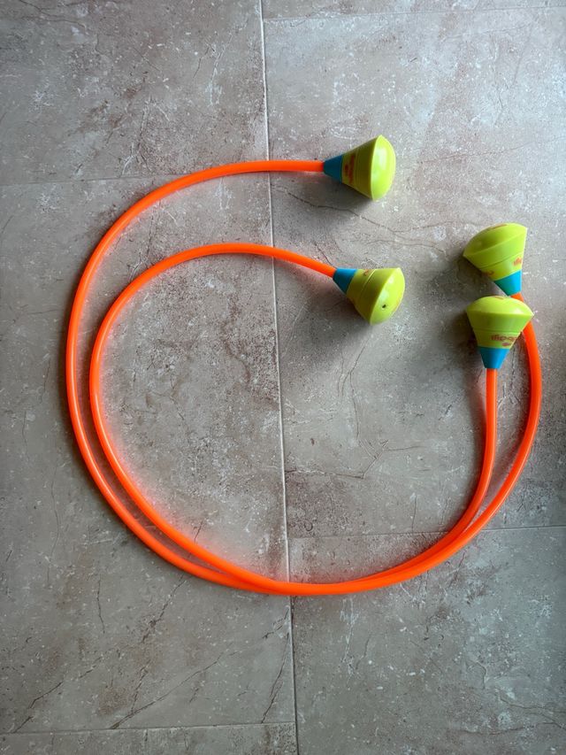 Detalles del productoSe vende juego acuático de Nabaiji con dos aros para hacer un recorrido en el fondo de la piscina. Son de color naranja y los topes verde lima son muy pesados para garantizar que el recorrido queda en el fondo de la piscina. están nuevos, los hemos probado una vez.