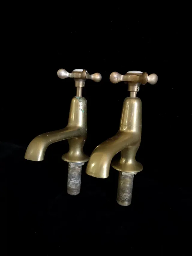 Detalles del productoConjunto de dos grifos antiguos fabricados en latón. Presentan un diseño clásico con manijas en forma de cruz c1900. Funcionan perfectamente. Tamaño grande de bañera o lavabo.