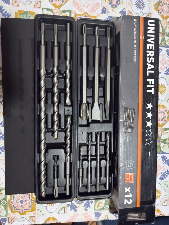 Detalles del productoSet de brocas y cinceles SDS para martillo percutor. Incluye una variedad de brocas y cinceles para diferentes trabajos.