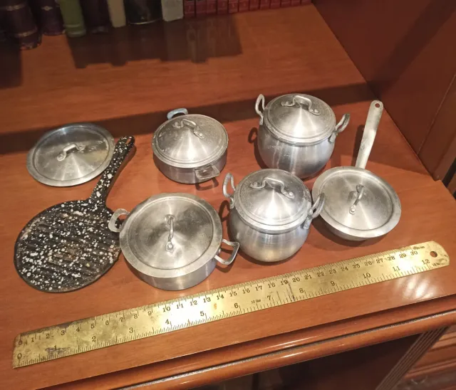 Conjunto de cacerolas y sartén de juguete en miniatura. - Muy bellas decoración vintage - Fabricadas en aluminio. - Incluye tapas. - Diseño clásico.