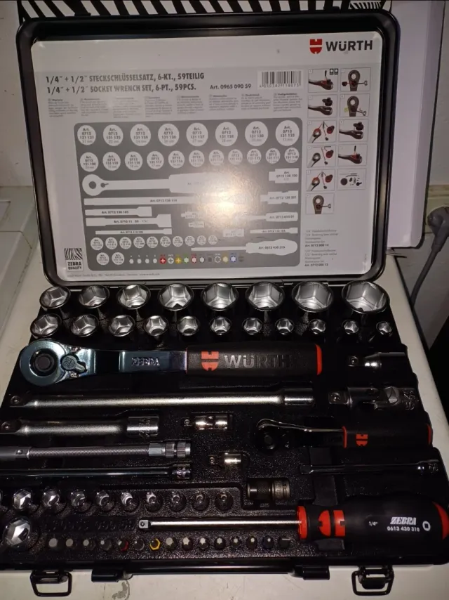 Set de llaves de vaso Wurth de 59 piezas, con medidas de 1/4 y 1/2. - Incluye carraca reforzada. - Maletín organizador. - Fabricado en Alemania.