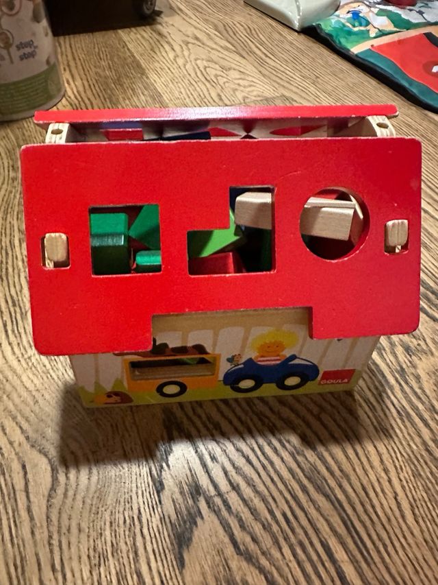 Juego de construcción de madera con bloques de diferentes formas y colores. - Piezas de madera. - Diseños variados. - Colores vivos.